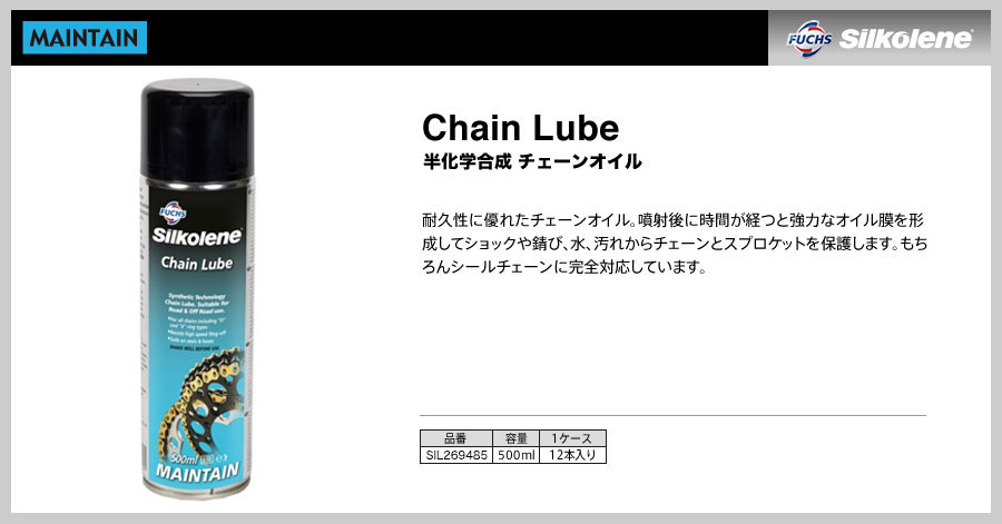 FUCHS Silkolene Chain Lubeは、強力なオイル膜保持と高い耐久性能を求めるユーザーに最適なチェーンメンテナンスオイルです。